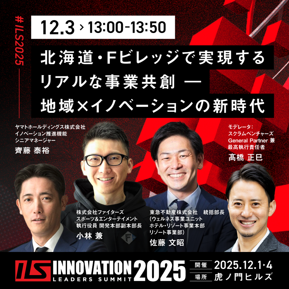 スクラムベンチャーズおよびスクラムスタジオ株式会社は、2025年12月3日に開催される Innovation Leaders Summit 2025(ILS 2025) において、「北海道・Fビレッジで実現するリアルな事業共創 ― 地域 × イノベーションの新時代」 をテーマに、グローバルアクセラレーションプログラム 「Hokkaido F Village X」(以下、HFX) に関するセッションを実施いたします。