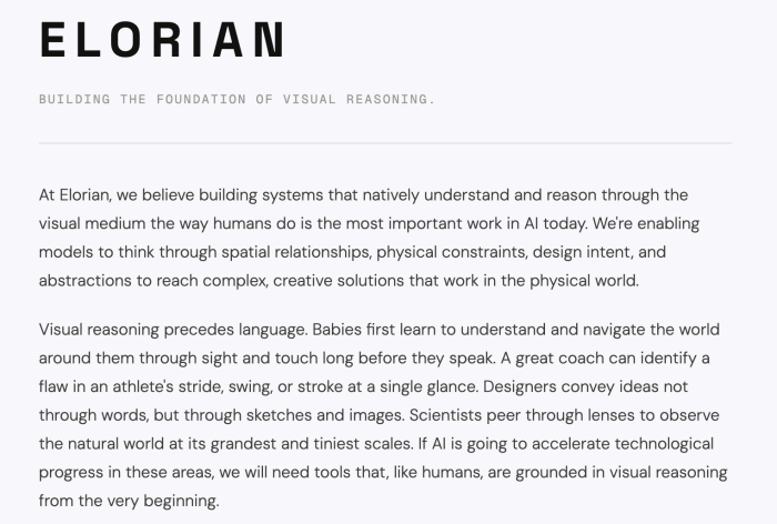画像などの視覚情報をテキストに変換してから処理する従来のアプローチとは異なり、視覚情報を直接理解するビジュアル推論モデルの構築を目指すAIスタートアップ。ロボット工学や航空宇宙、衛星画像解析、医療分野などでの活用が期待されている。元Google DeepMind研究者のAndrew Daiが創業したことでも注目されている。今回の資金調達によるバリュエーションは3億ドル。